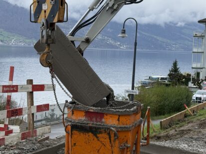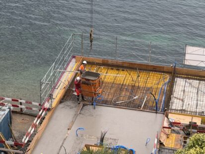Aber das hielt uns nicht auf! Der Beton wurde mit Lieferwagen und einem kleinen Lastwagen durch eine enge, kurvige Strasse transportiert – und das den ganzen Tag über, vom frühen Morgen bis zum Abschluss der Betonetappe.